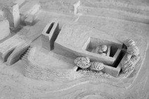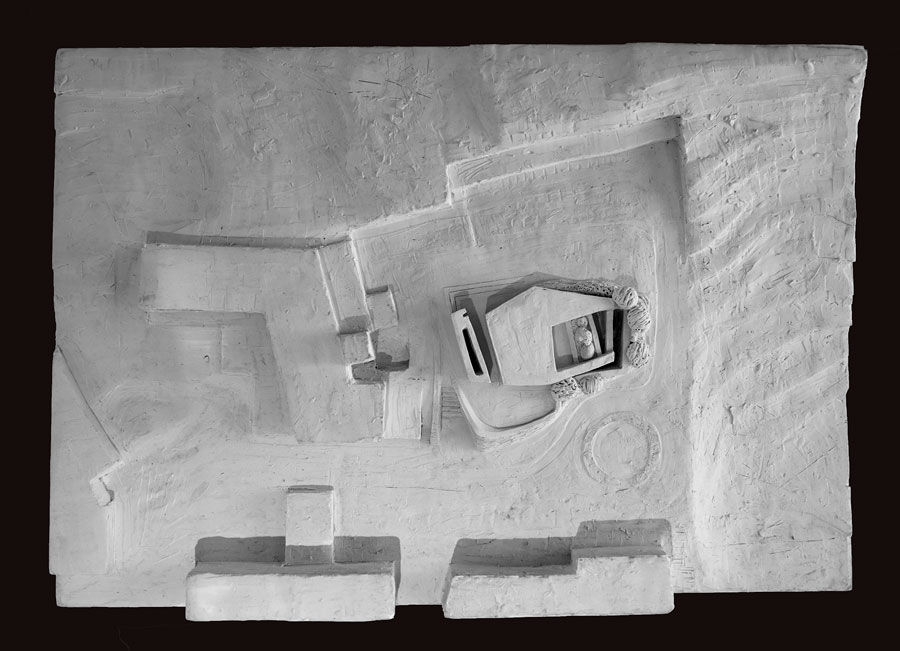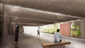 Es en este espacio, al final del viaje al interior de la tierra, donde se perciben en su totalidad las dos grandes chimeneas que confieren luz y verticalidad al proyecto; a través de ellas, ejerce el